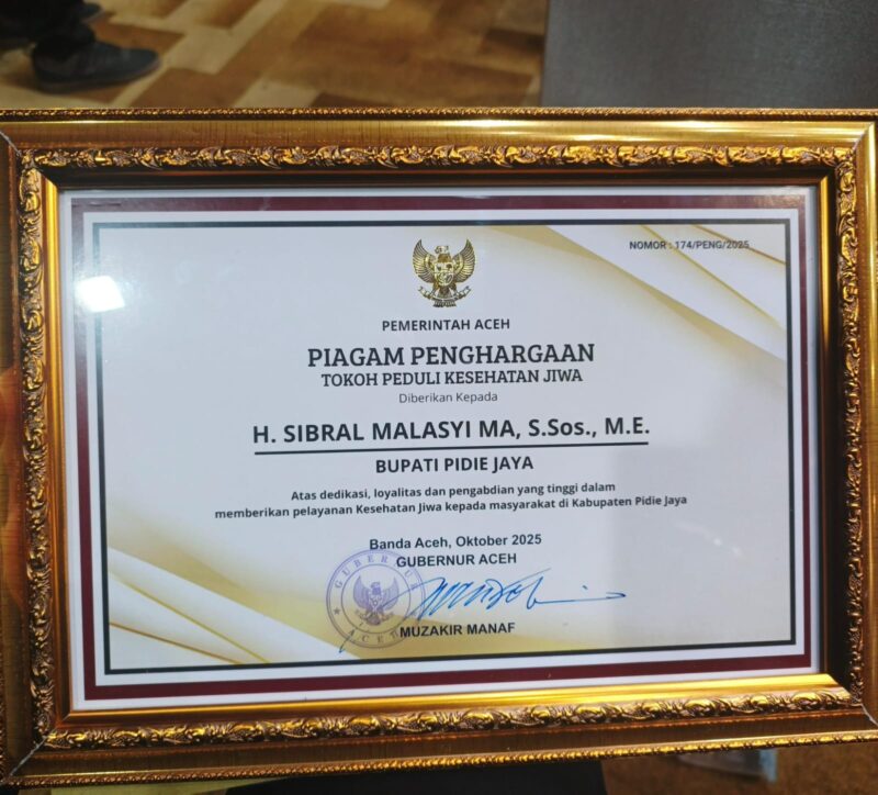Pidie Jaya | InfoAcehNews.net — Masyarakat Pidie Jaya patut berbangga. Bupati mereka, H. Sibral Malasyi, menerima piagam penghargaan dari Gubernur Aceh, Muzakkir Manaf, atas dedikasinya sebagai Tokoh Peduli Kesehatan Jiwa. Penghargaan tersebut diserahkan pada Senin, 24 November 2025.